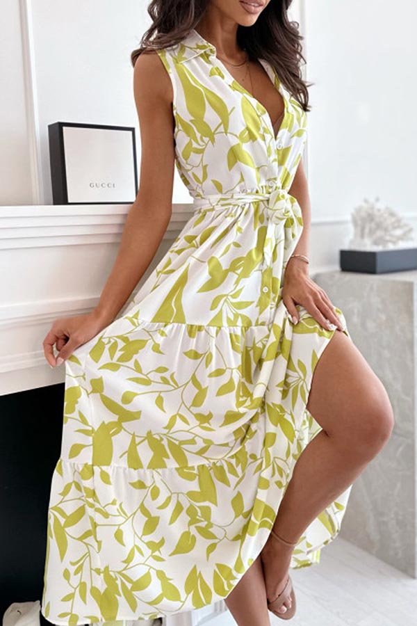 PLANT SILHOUETTE PRINTED BELT SHIRT MIDI DRESS