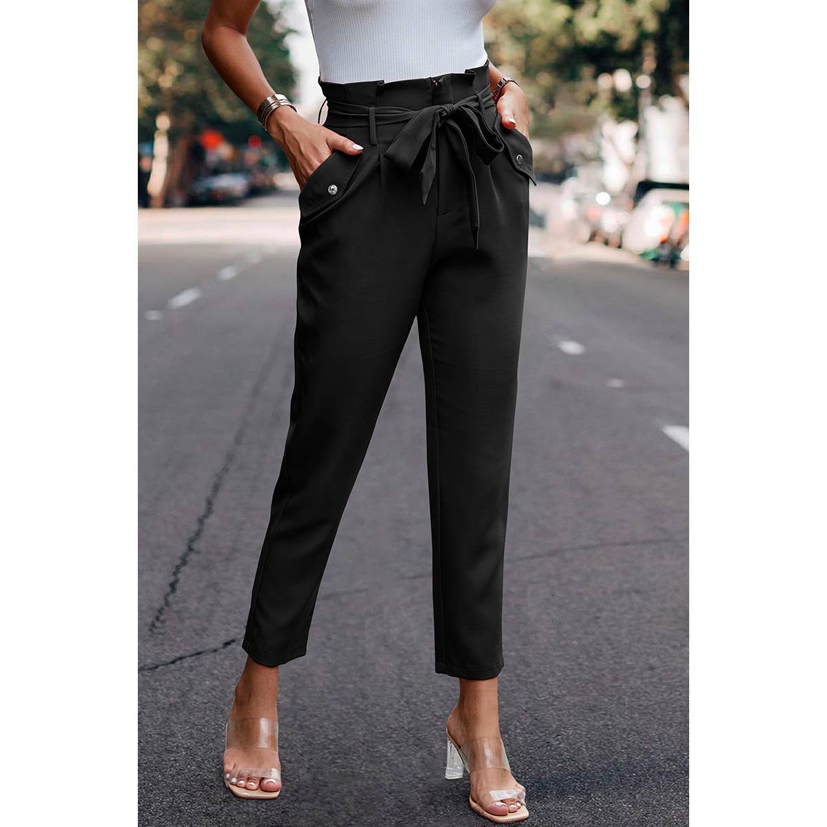 Solid Tall Paperbag Waist Solid Slim Fit Pants