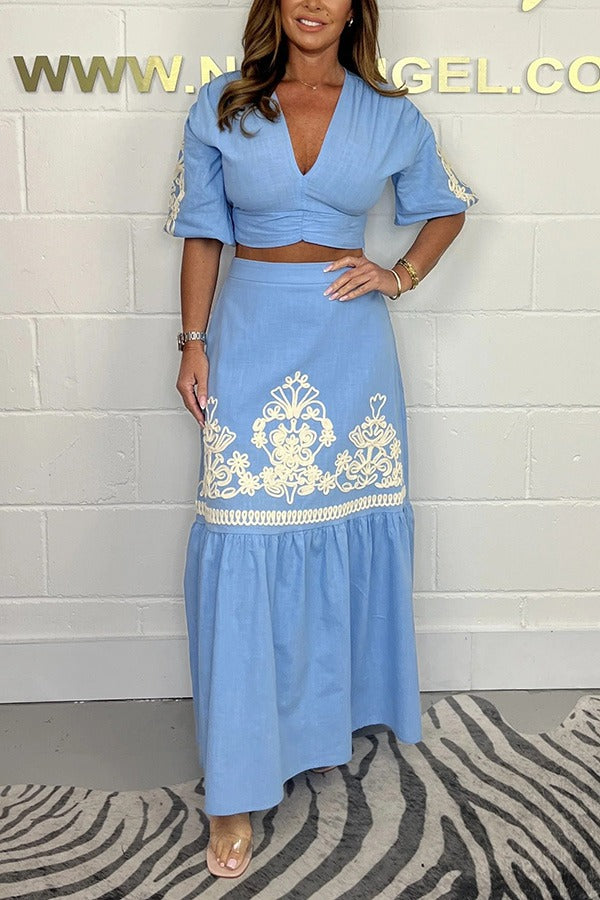 Stylish V-neck Puff-sleeved Crop Top and Elastic Waist Paneled Maxi Skirt Set