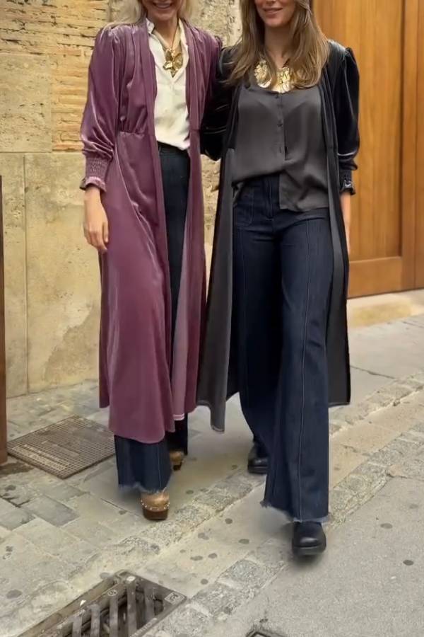 Velvet Puff-Sleeve Stand-Collar Long Coat